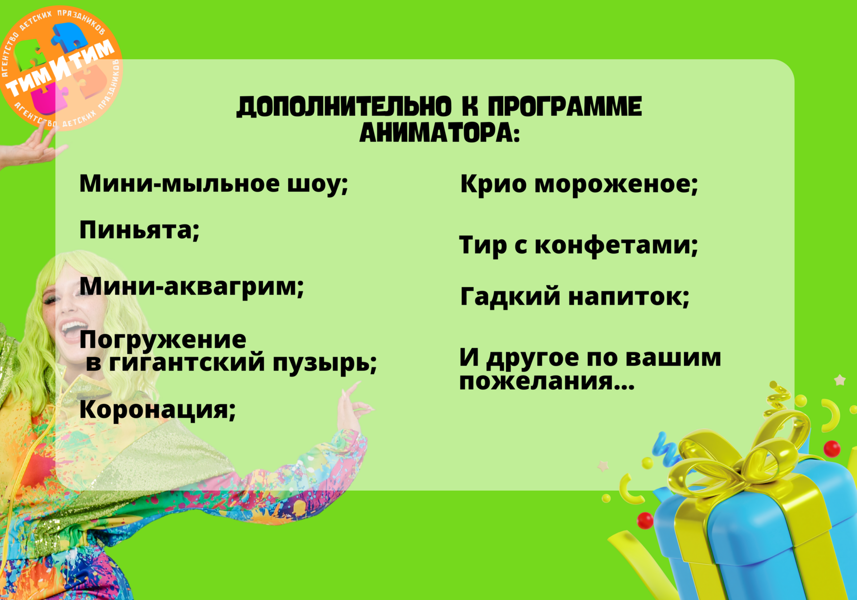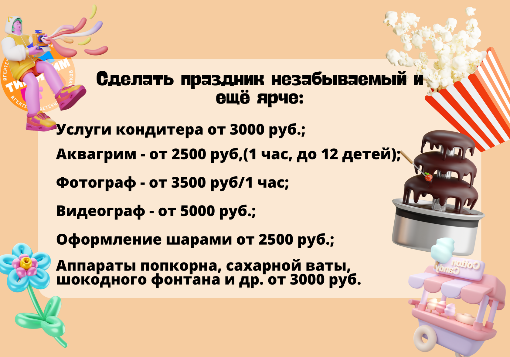 Мы организуем день рождение, выпускной, новый год, праздник в школу, детский сад, лагерь или детскую зону для взрослых мероприятий.